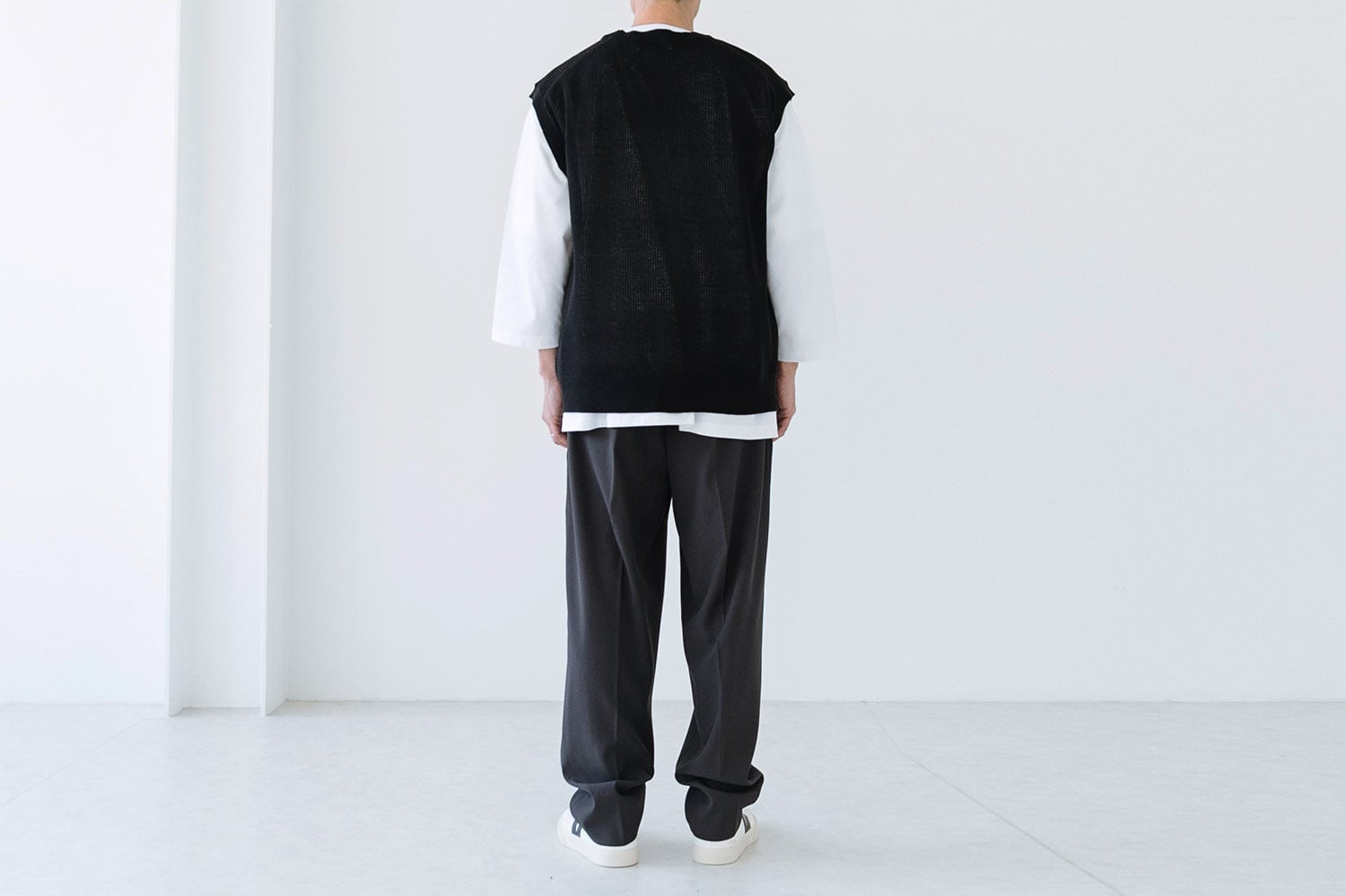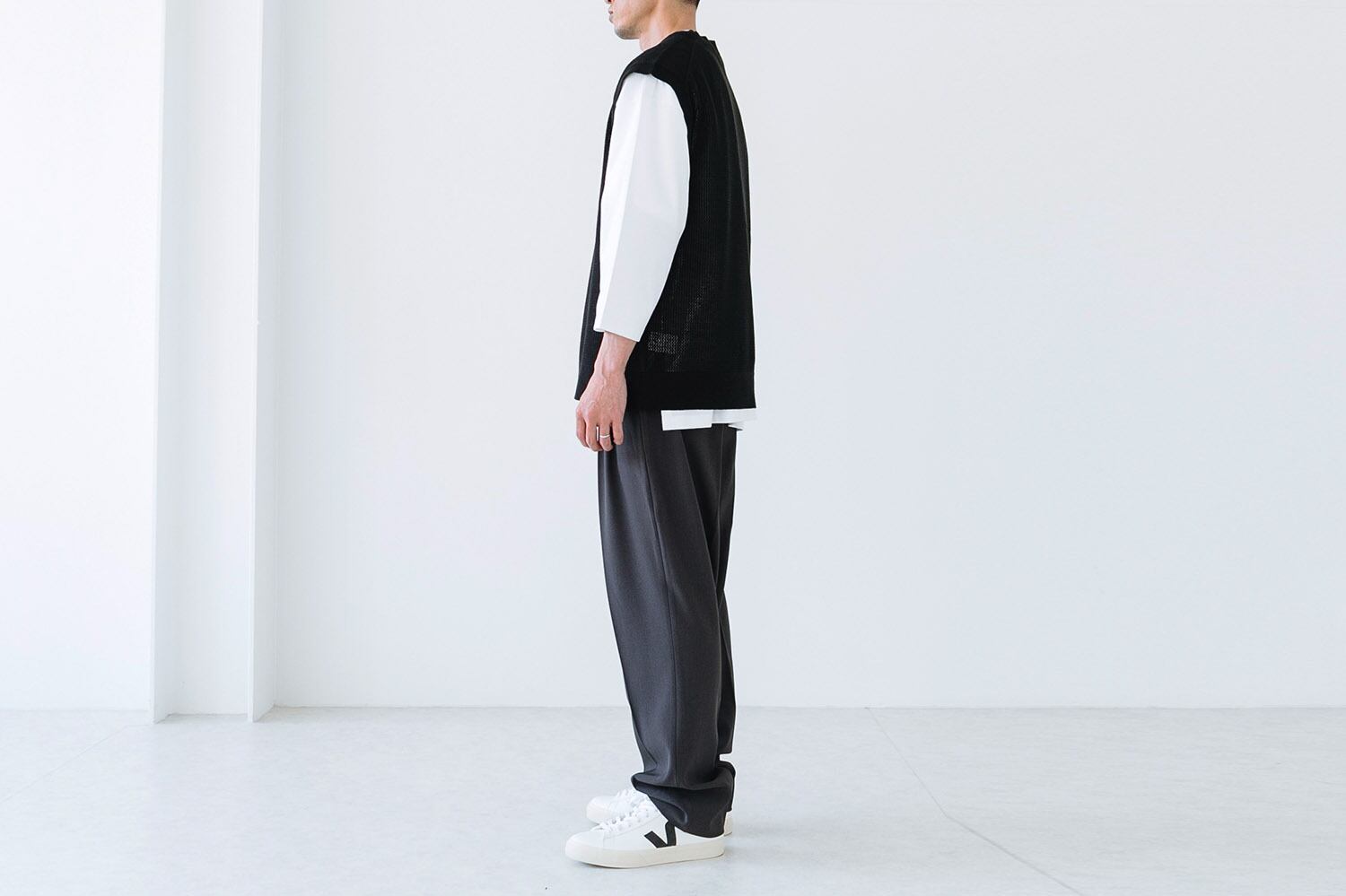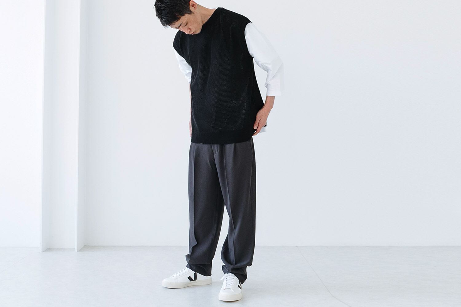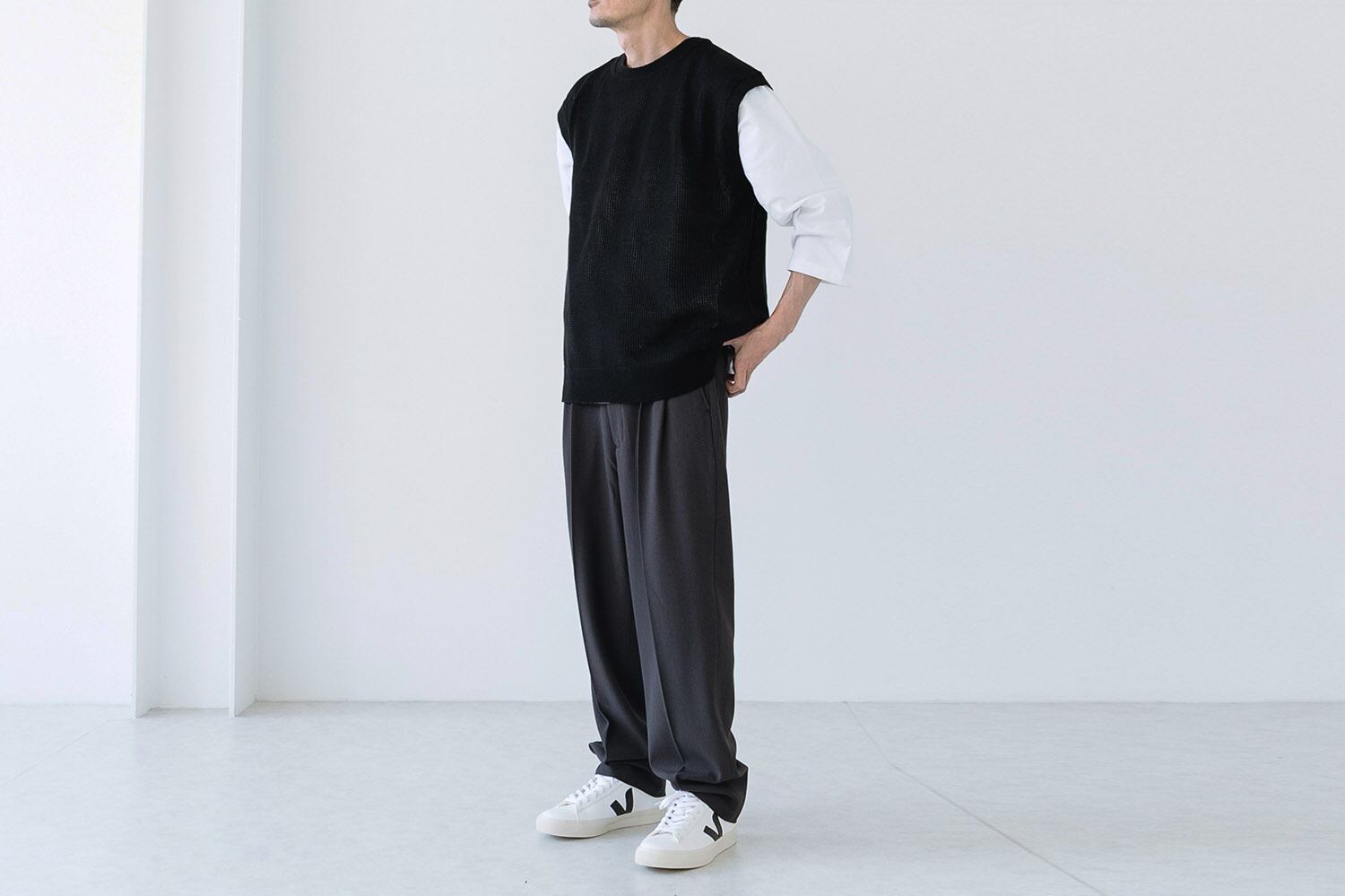 Tシャツはもちろん、夏場はスリーブレスアイテムとの着合わせもおすすめです。