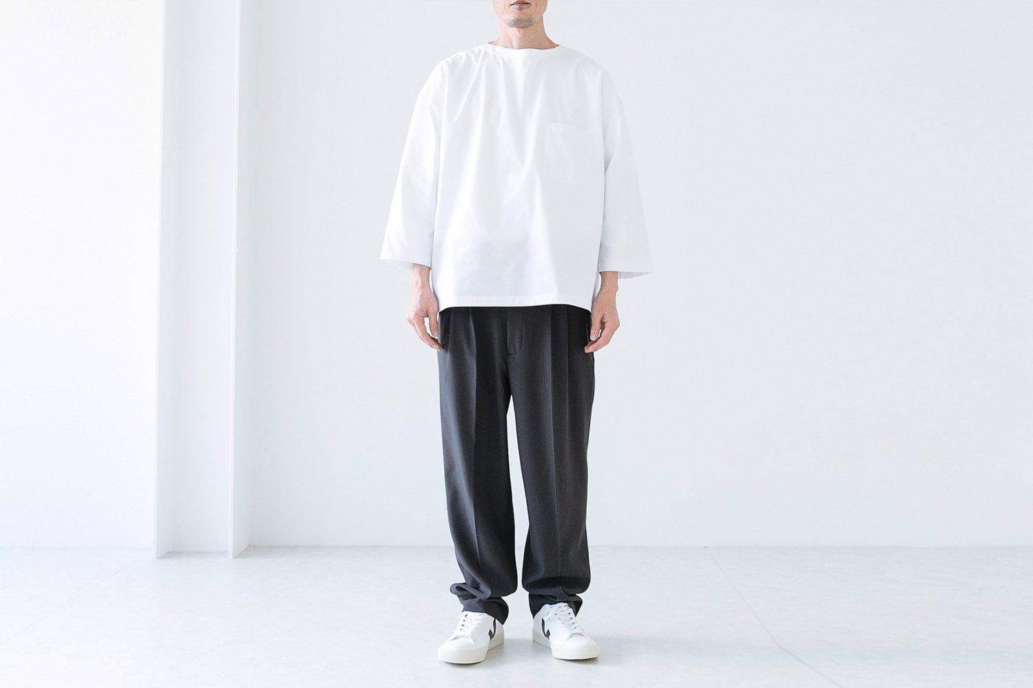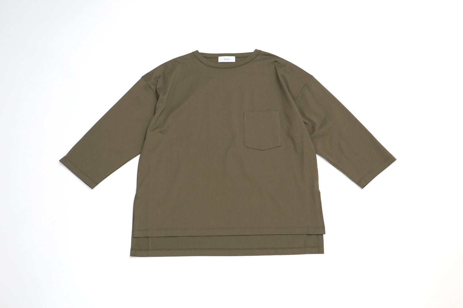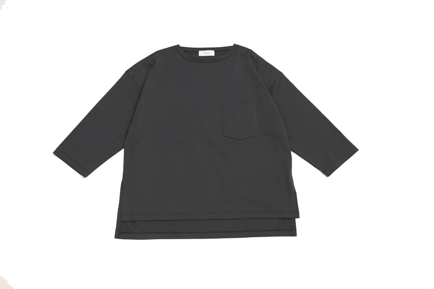 デザインは前後差付きのサイドスリットと、7分袖よりもやや長めな8分の袖丈がポイントで、ブレスレットや時計などの小物アレンジが映え、且つカジュアルになりすぎない袖丈に仕上げられています。
