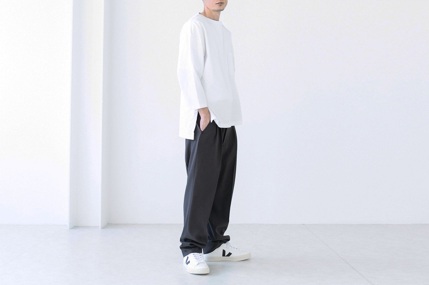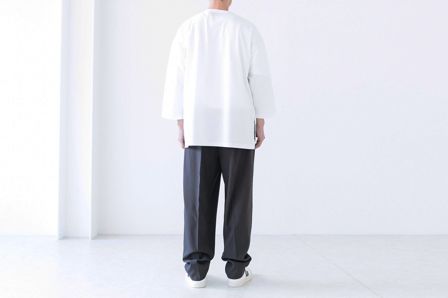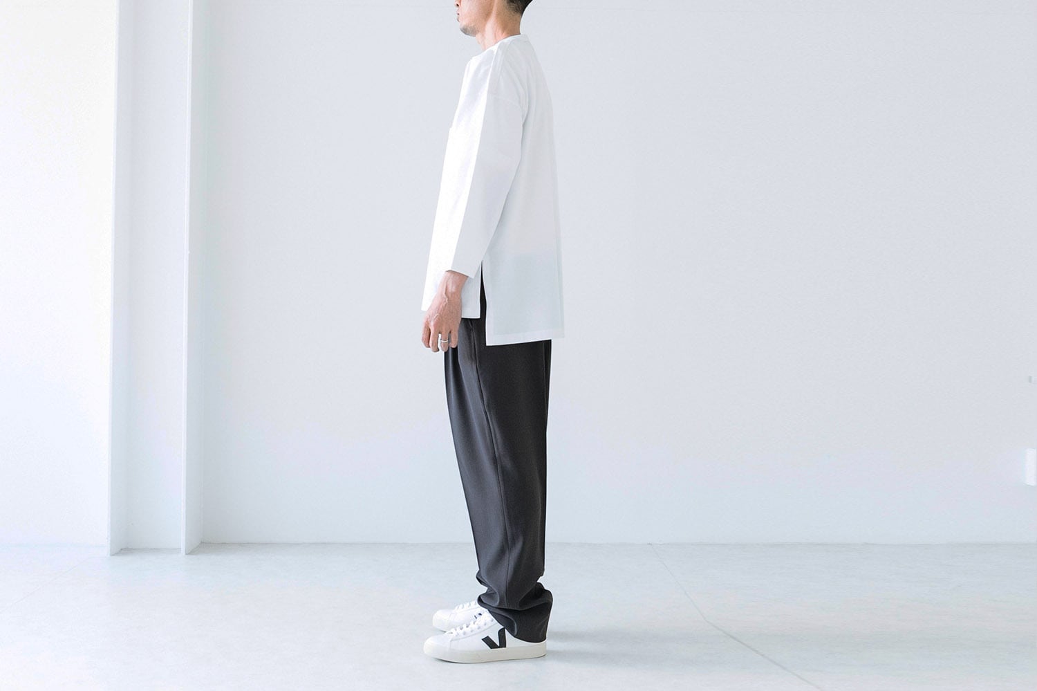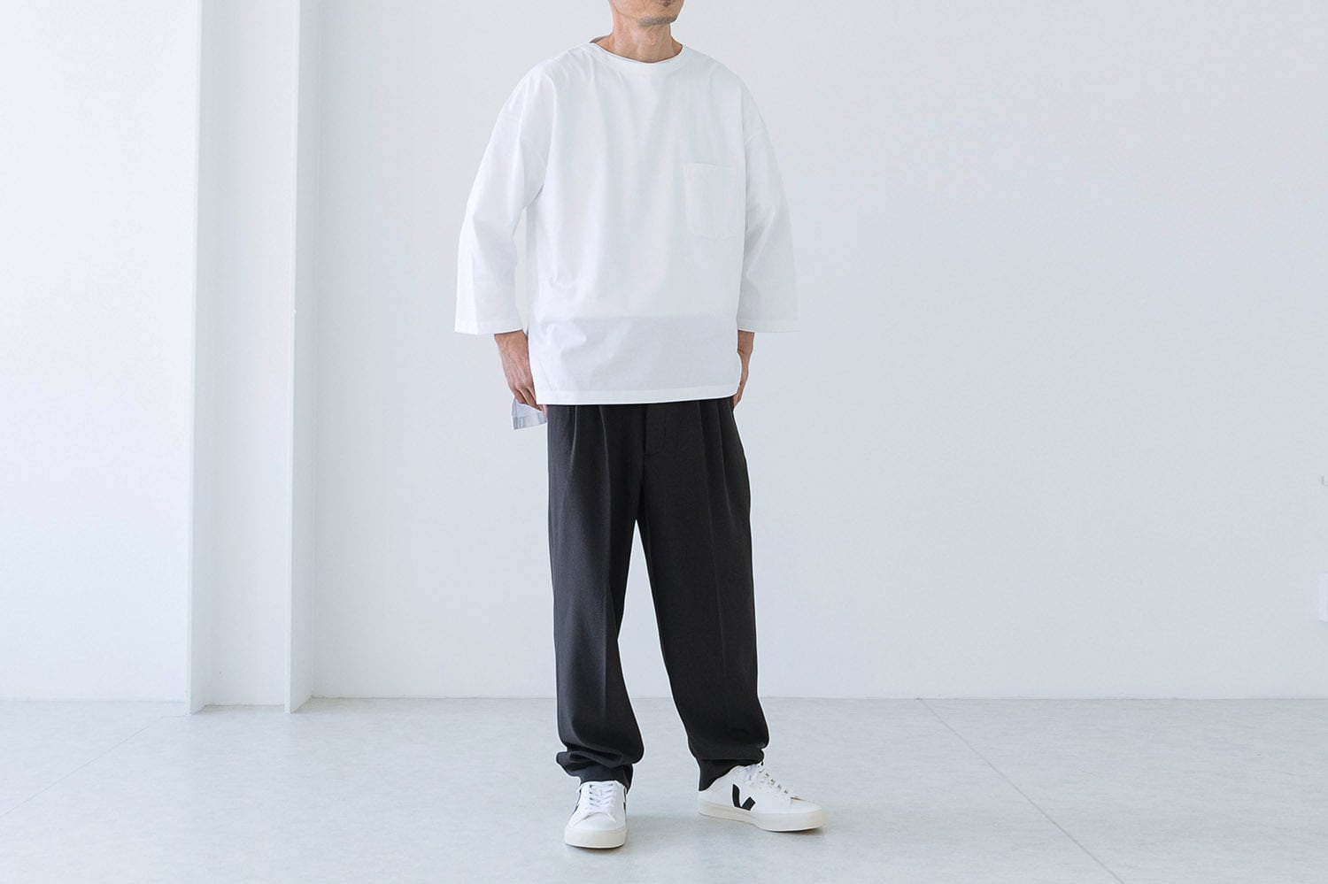 デザインは前後差付きのサイドスリットと、7分袖よりもやや長めな8分の袖丈がポイントで、ブレスレットや時計などの小物アレンジが映え、且つカジュアルになりすぎない袖丈に仕上げられています。